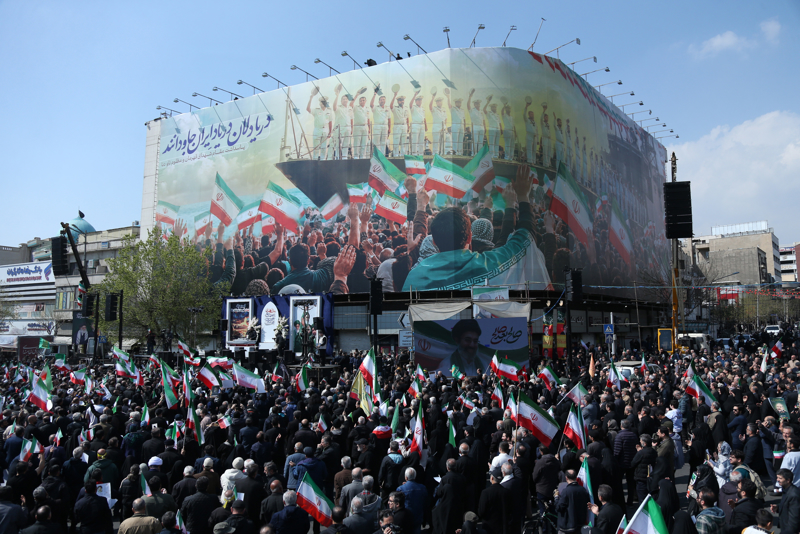 伊朗民众在首都德黑兰革命广场高呼反美、反以口号,强烈谴责美以对伊军事行动。新华社记者 沙达提 摄