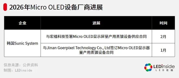 设备厂商方面,2月5日,Sunic System与宏禧科技签署OLEDoS蒸镀设备供应合同,1月初又与Jinan Goerpixel达成合作。近年来,该公司已向国兆光电、视涯科技、湖畔光芯等多家企业提供Micro OLED相关生产设备,支撑产线建设与扩产进程。